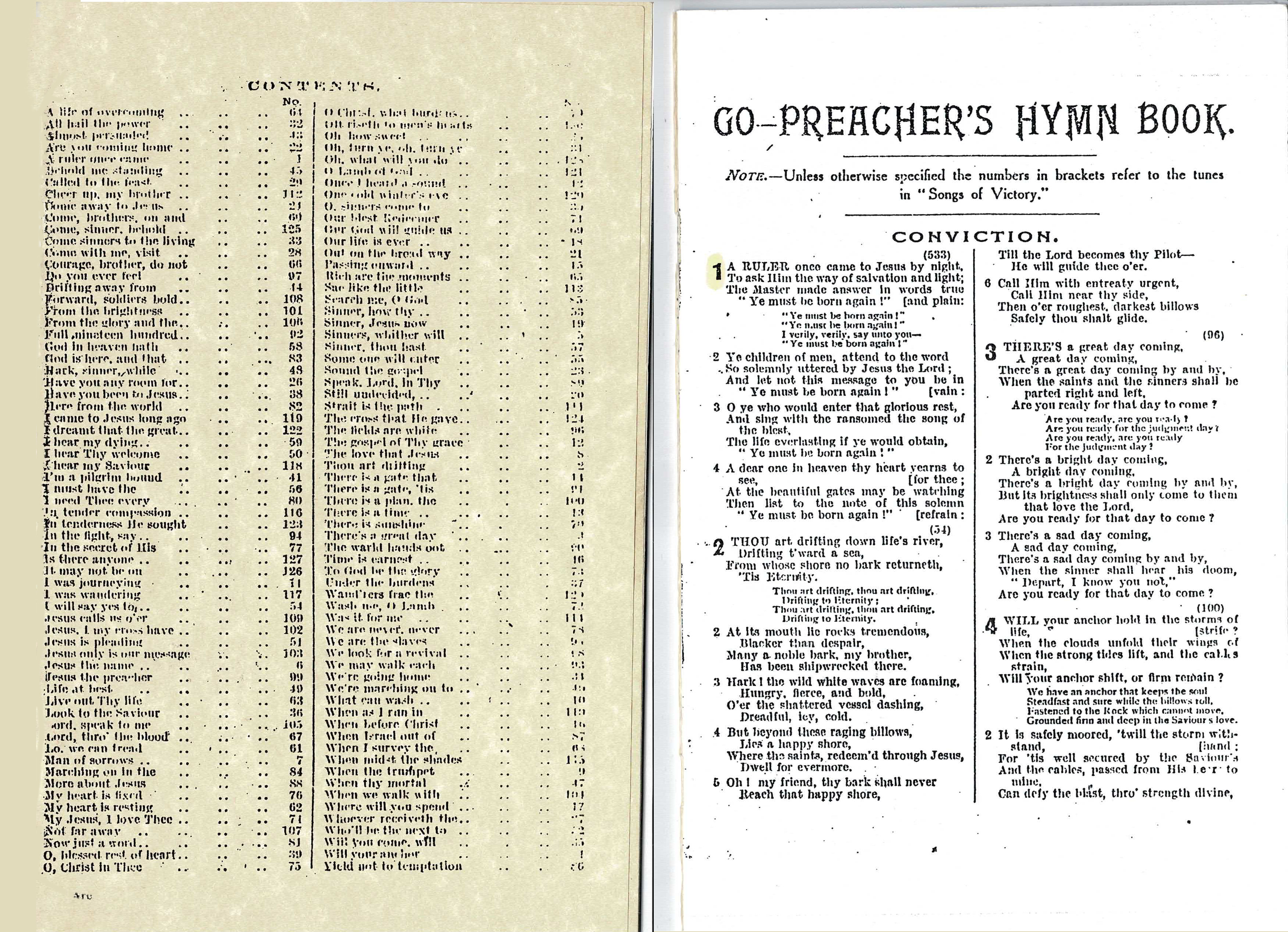 Go-Preacher Hymn Book --- Index of hymns and first page.