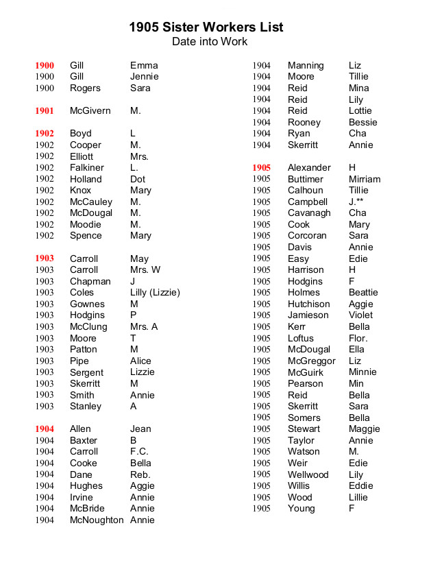 1905 Sister Workers by Year into Work