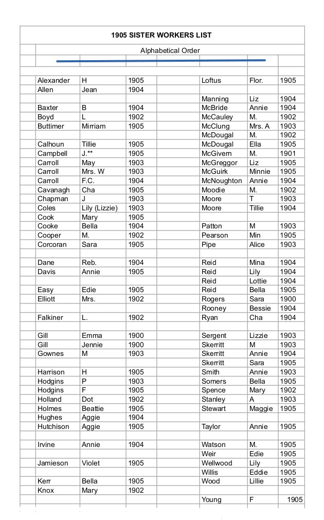 1905 Sister Worker List in Alphabetical order
