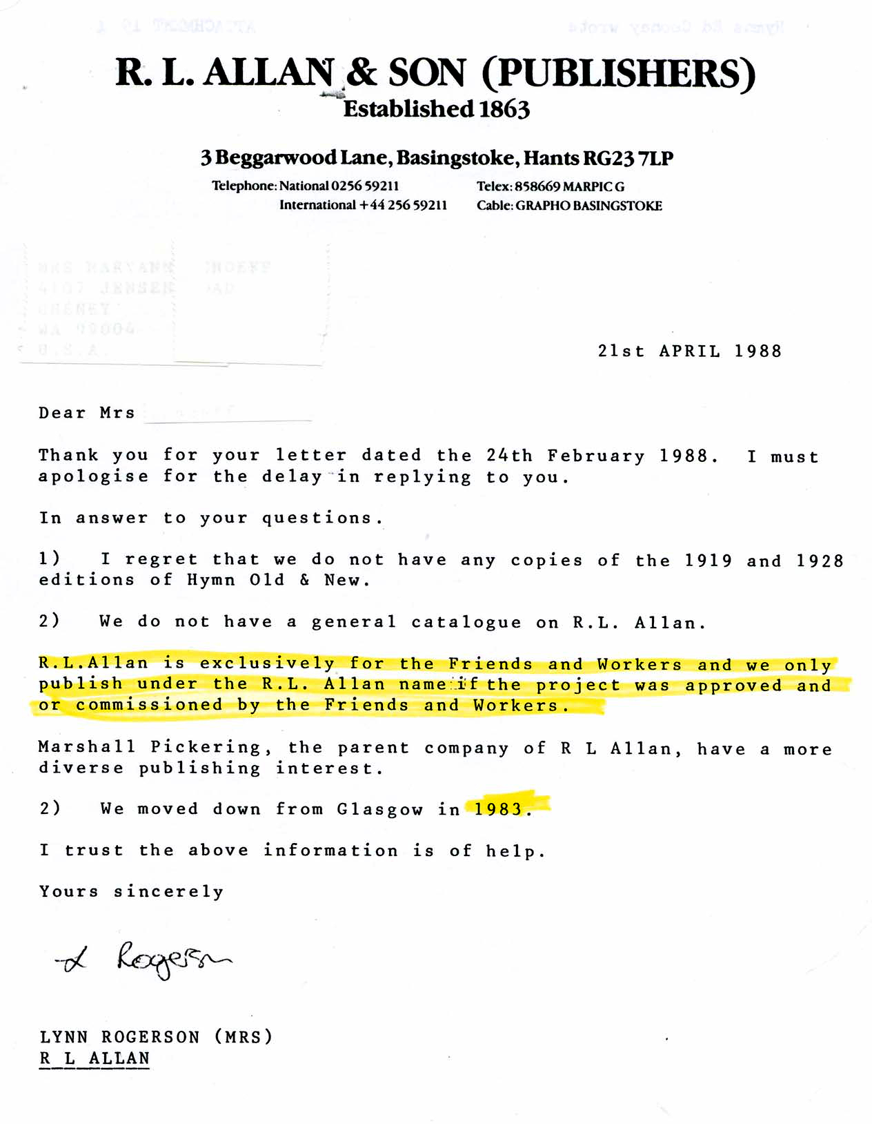 April 21, 1988 Letter by Lynn Rogerson of R. L. Allan