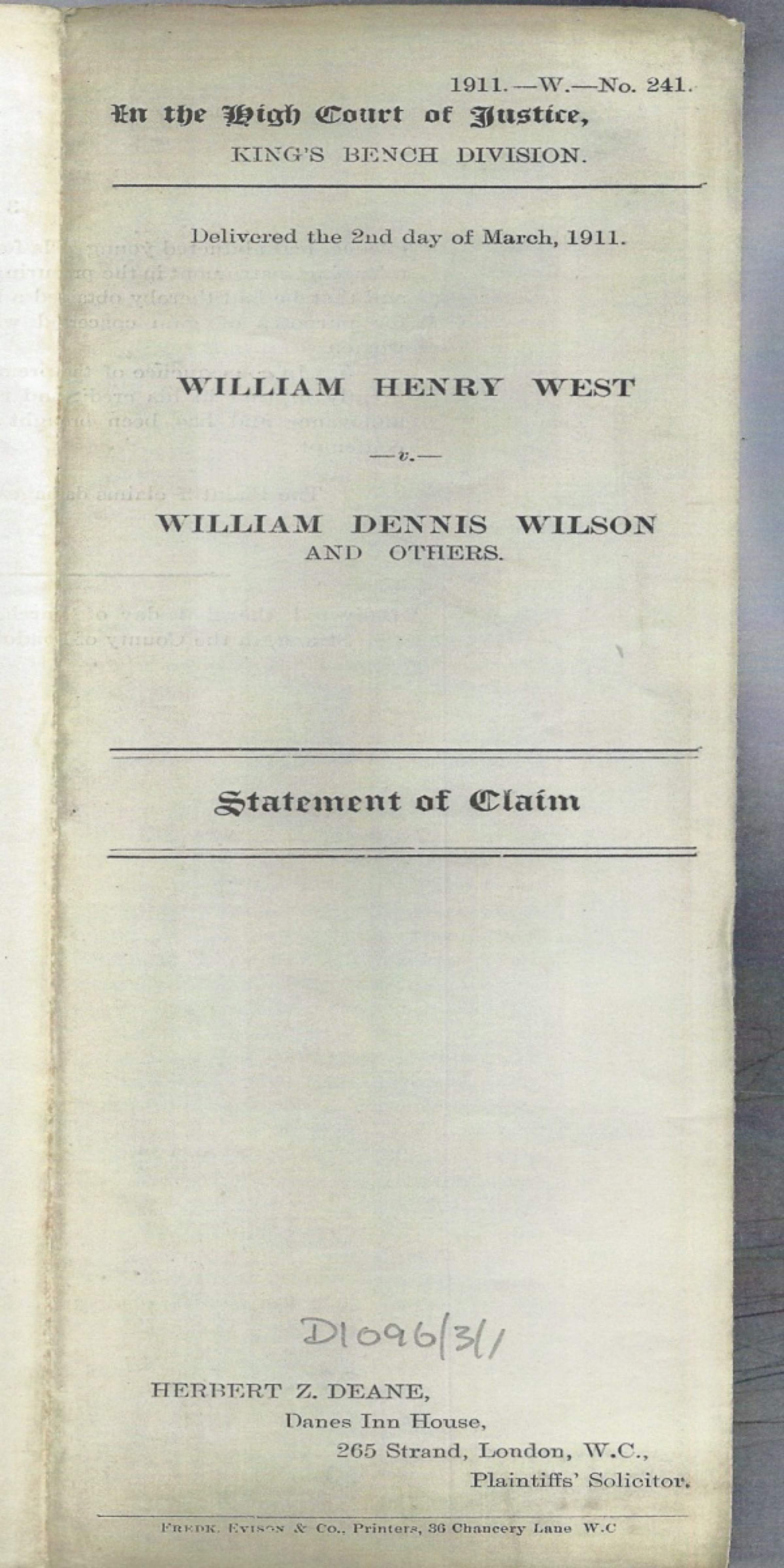Case No. 241 - William Henry West v. William Dennis Wilson, James W. Wilson and William M. Allen (Filed January 23, 1911 in England)