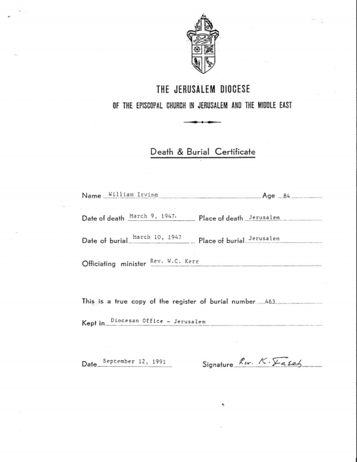 Death & Burial Certificate by The Jerusalem Diocese