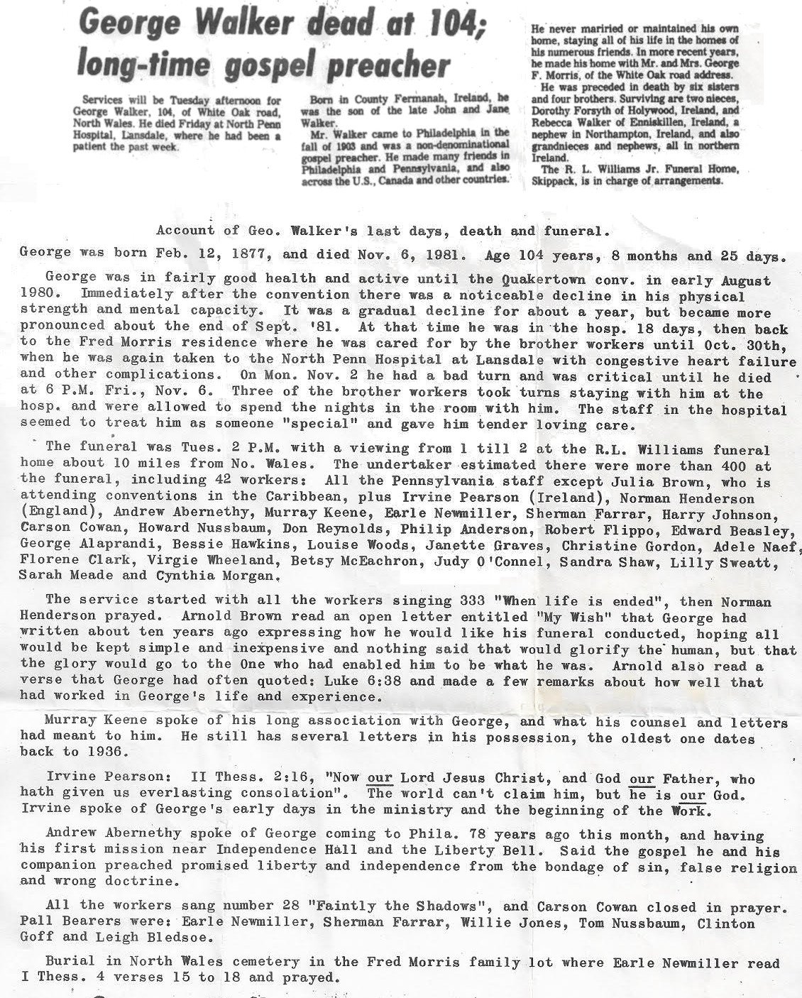 George Walker notice of death and Funeral notes.