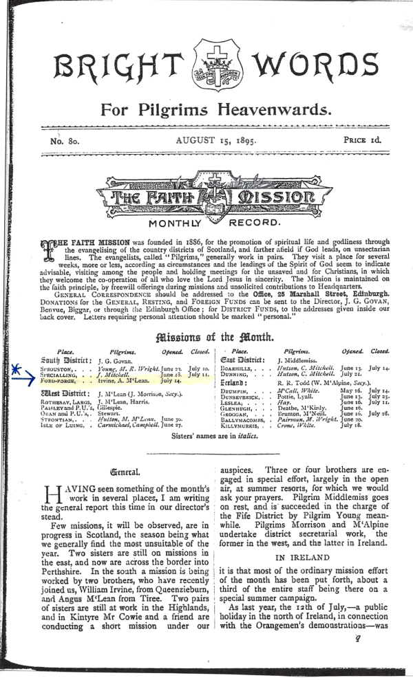 This was the first edition of "Bright Words" that mentioned Wm Irvine's name and mission. This was after he became a Faith Mission pilgrim worker in July 1895.