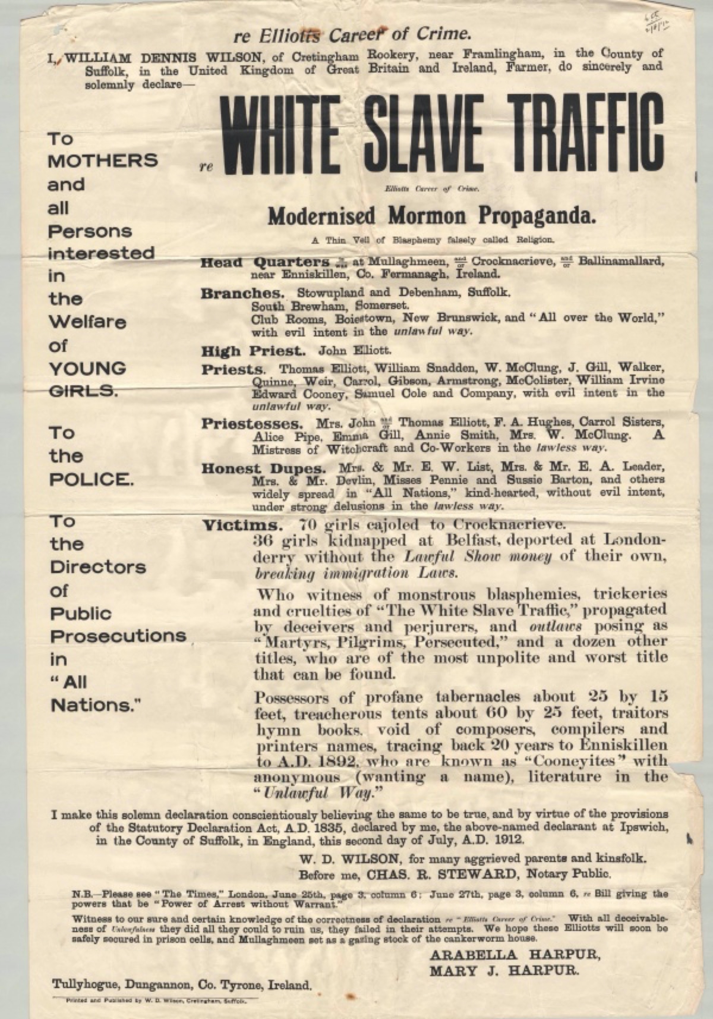 Wilson's poster accusing workers and friends of white slave traffic