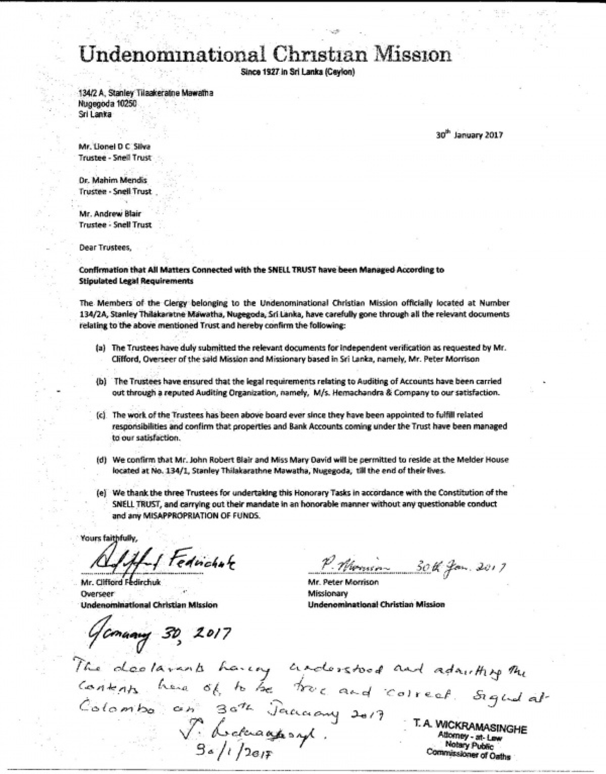 of Sri Lanka on "Undenominational Christian Mission" letterhead.