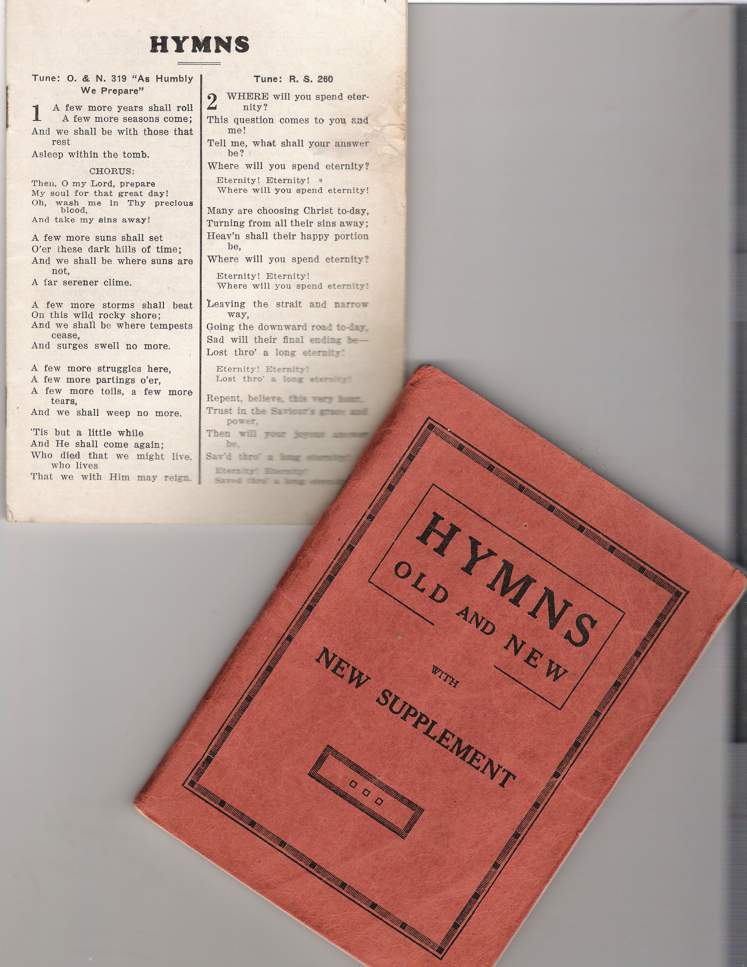 Orange 1935 "Hymns Old and New with New Supplement" (text only) printed by R. L. Allan & Son.