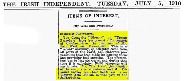 Mr. Wm. Irvine, the founder of the sect, is in attendance and Mr. Edward Cooney,
