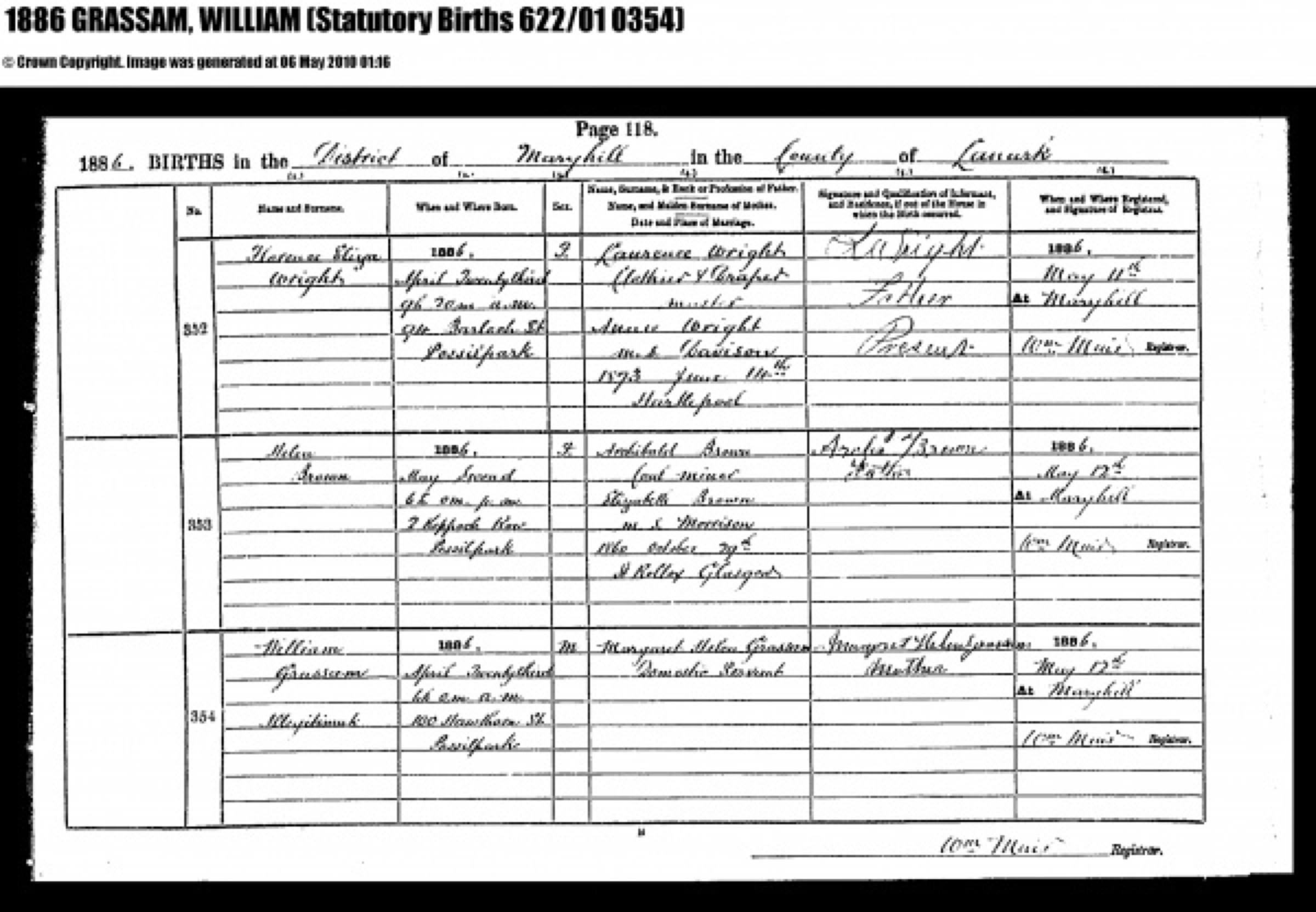 illegitimate son of Margaret Grassam born April 23, 1886,