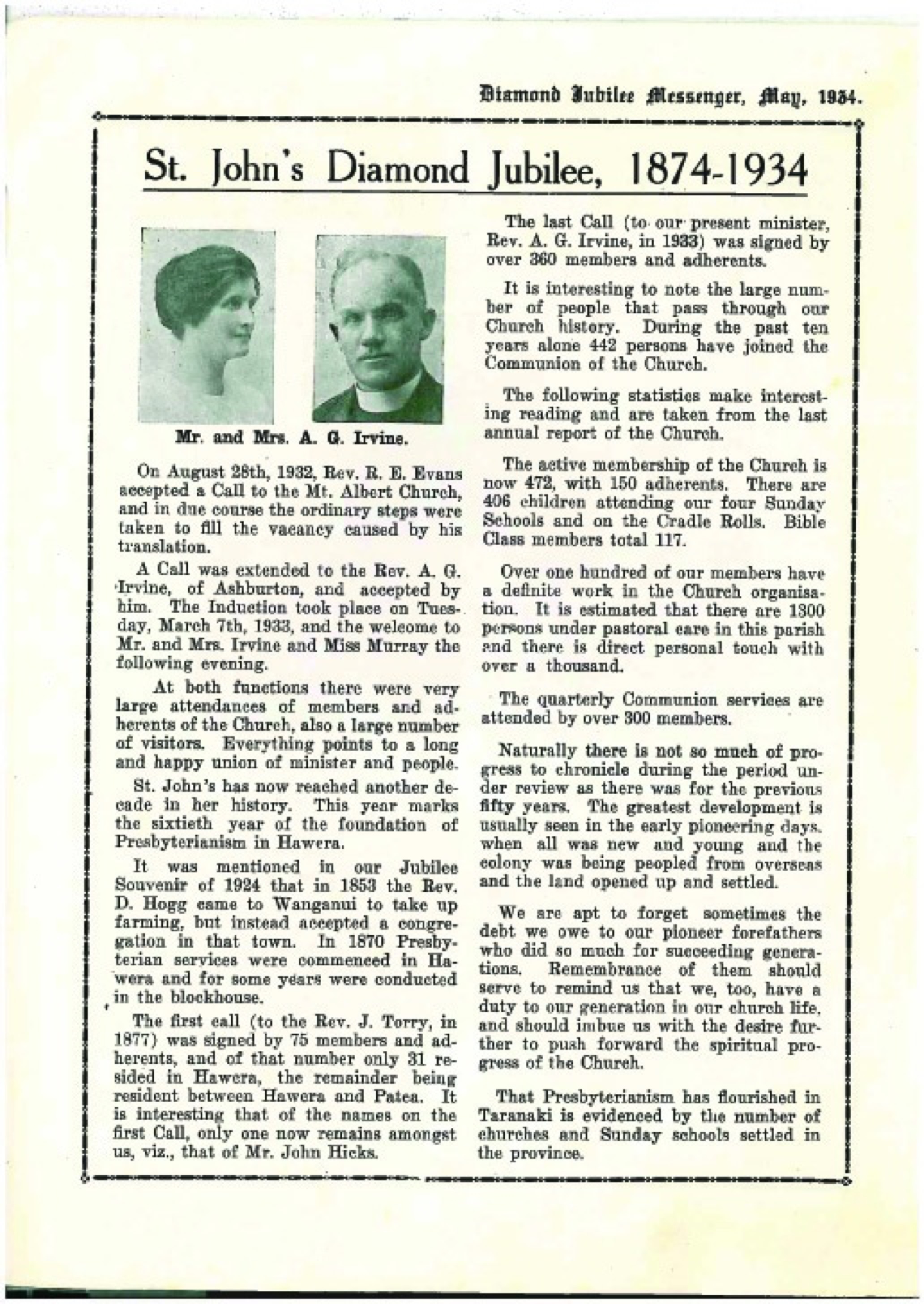 Induction of Rev. Archibald Irvine to the St. Johns Presbyterian Church at Hawera, NZ on March 7, 1933.