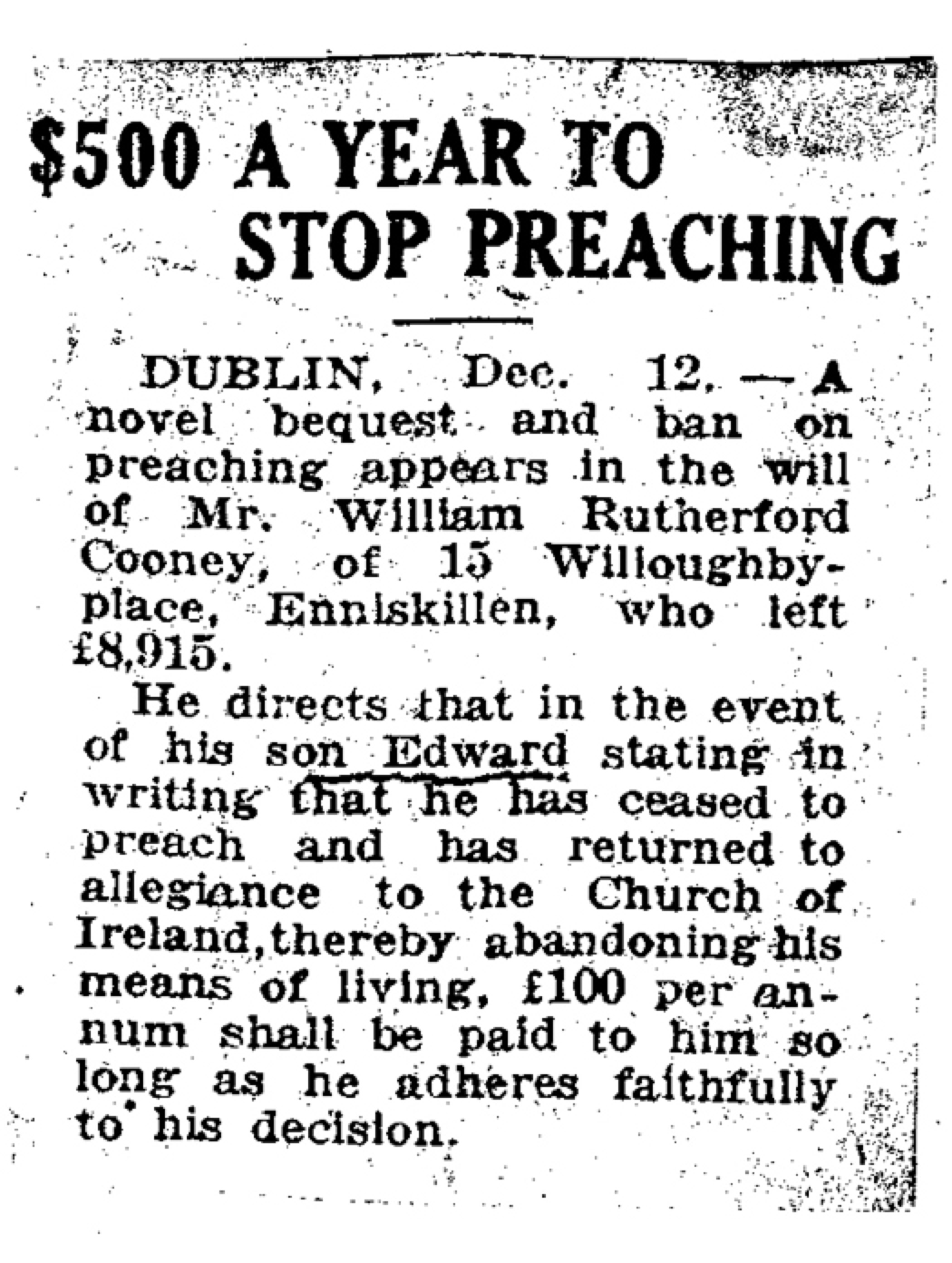 Edward Cooney and offer of $500 a year to Stop Preaching The will of Cooney's father provided that Edward would receive 100 pounds