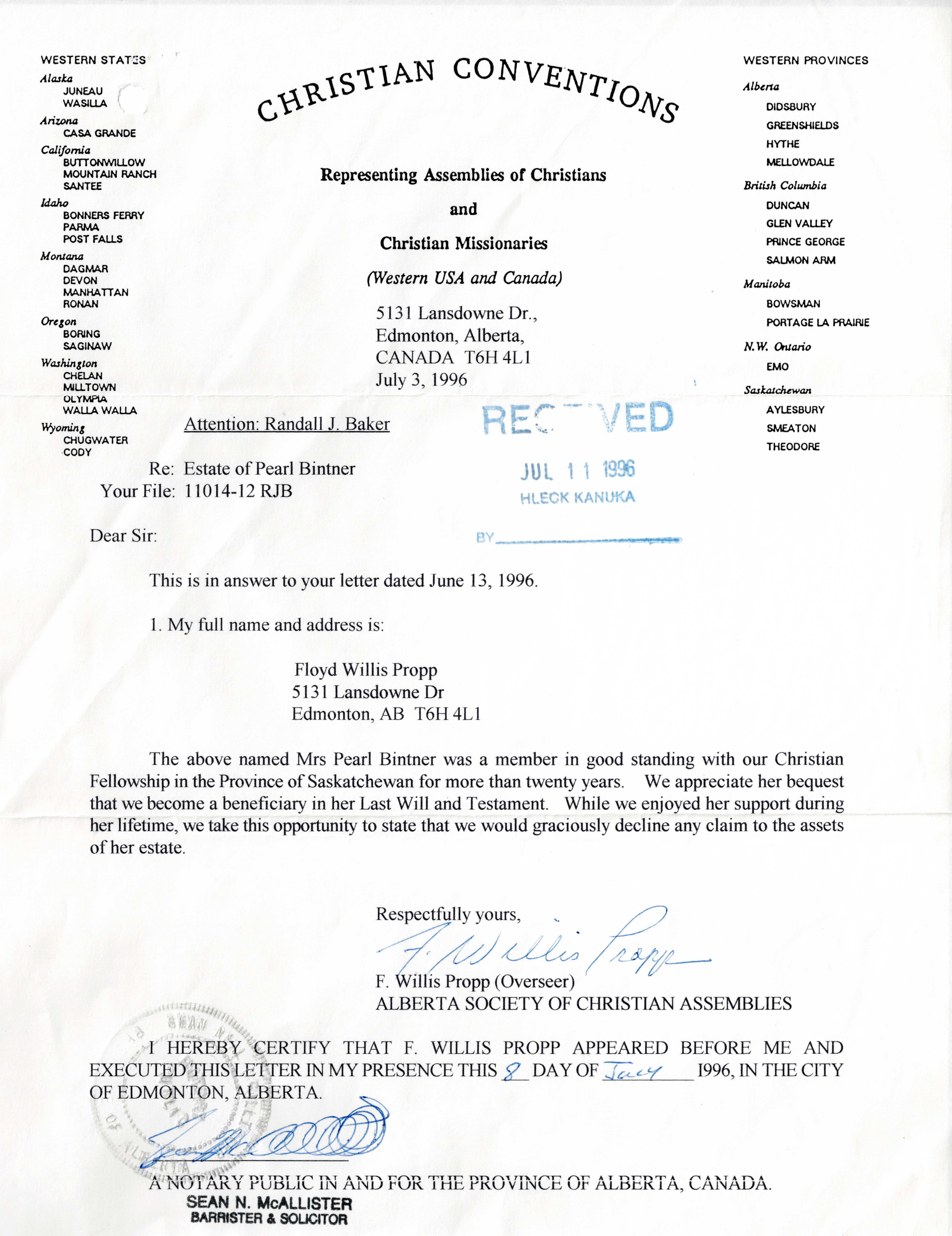 1996 Letter by Willis Propp using Christian Convention letterhead for Western USA & Canada NW.