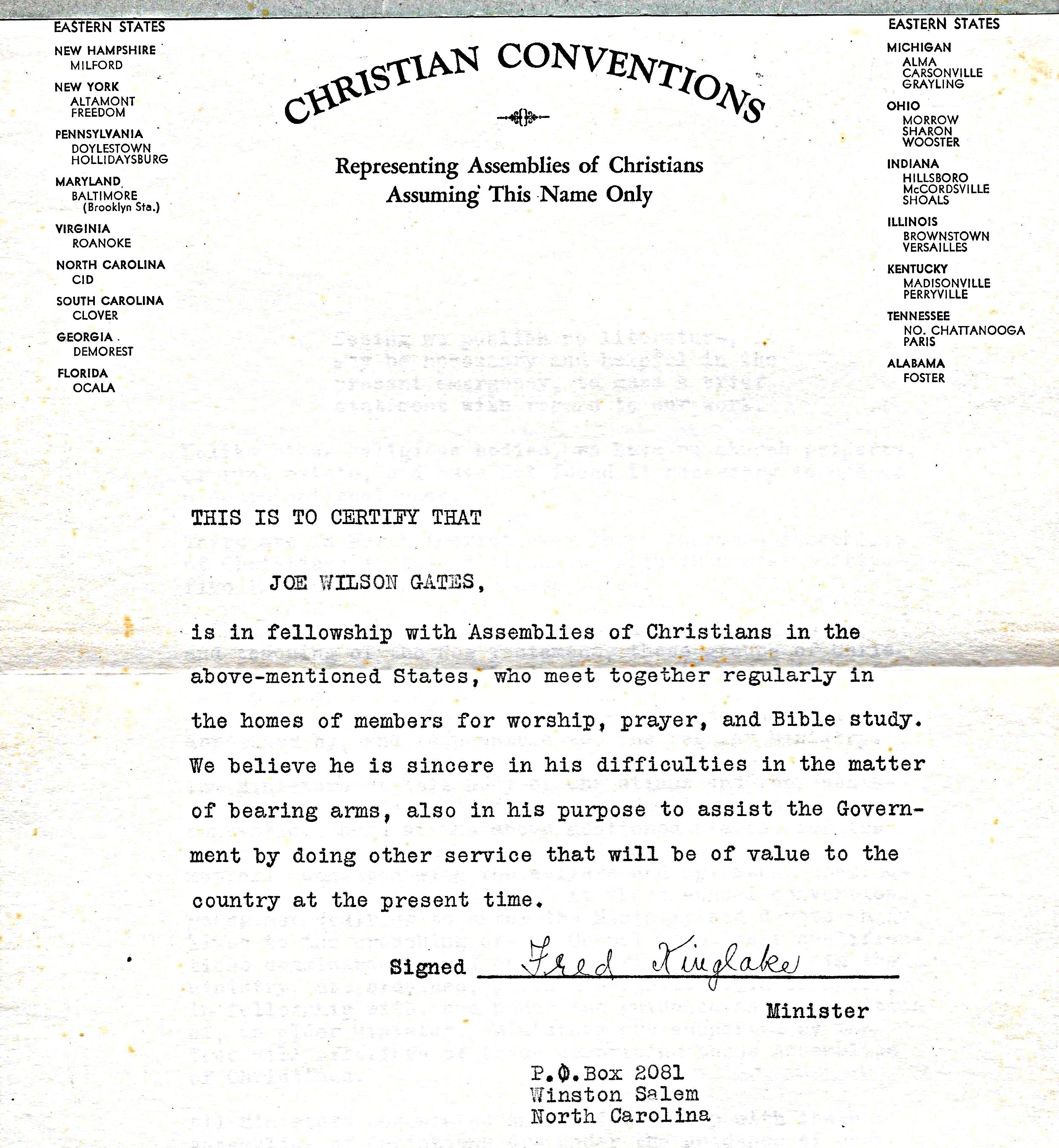 Christian Convention Letterhead for Joe Wilson Gates -Eastern & Southern states.