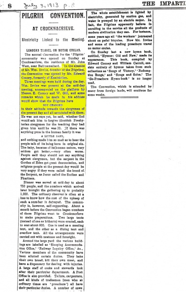 Impartial Reporter: William Irvine, one of the founders of the Go-Preachers’ Society, said it was Protestant evangelical. Its tenets containing nothing relating to the sexes that was different from the teaching of other denominations.