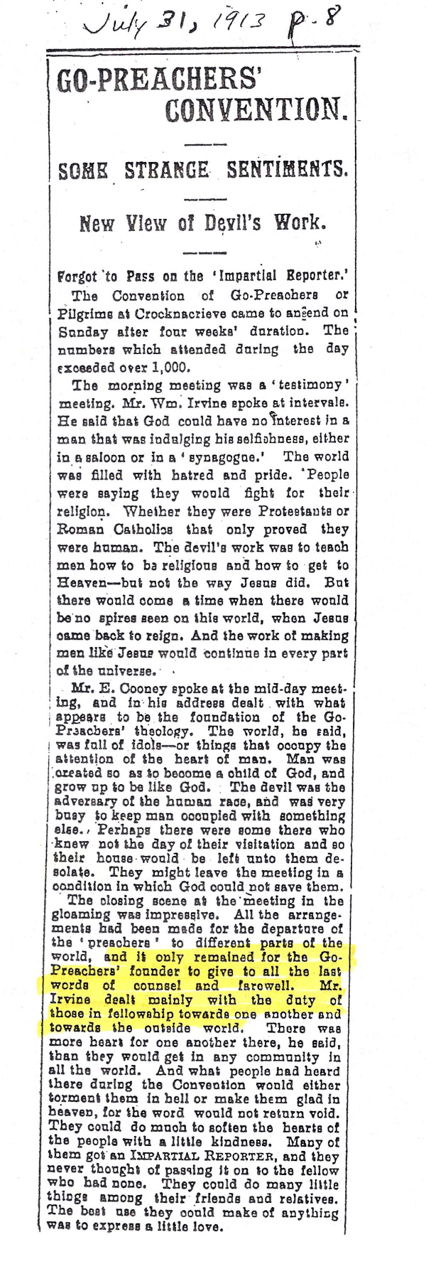 Impartial Reporter: The closing scene at the meeting in the gloaming was impressive. All the arrangements had been made for the departure of the ‘preachers’ to different parts of the world, and it only remained for the Go-Preachers’ founder to give to all the last words of counsel and farewell. Mr. Irvine dealt mainly with the duty of those in fellowship towards one another and towards the outside world.